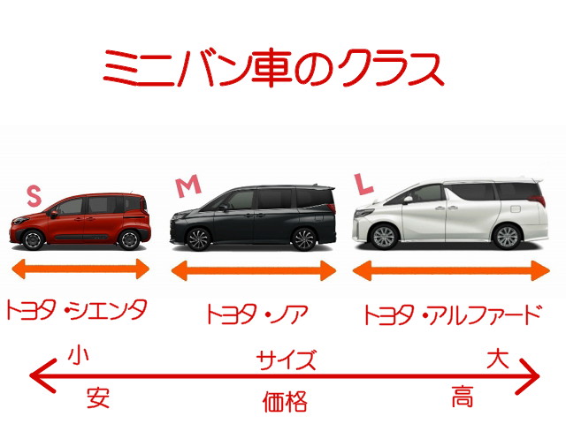 また、ミニバン車は主に、ボディサイズが小さく比較的に車両価格が抑えられているタイプをS(スモール)クラス、ボディが大きく乗り心地やラグジュアリー性を重視したタイプをL(ラージ)クラス、ボディの大きさと装備品のバランスがとれたタイプをM(ミドル)クラスと分けている点が特徴です。