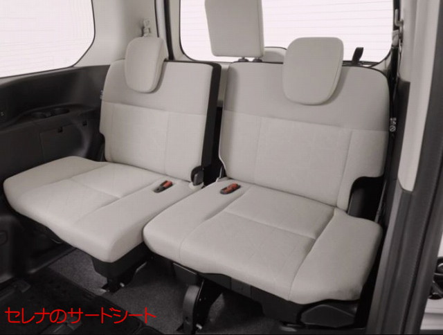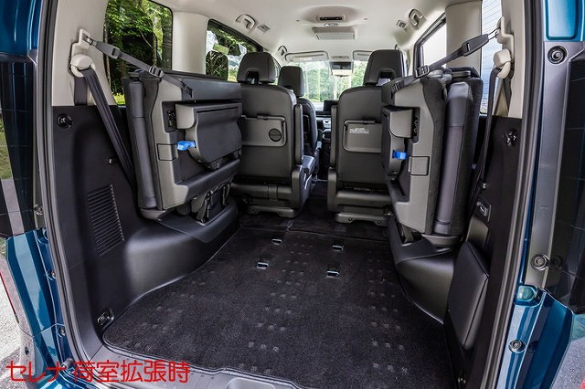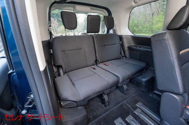 一方、セレナはノア/ヴォクシーと同じく、荷室を拡張する際はサードシートを跳ね上げる方式を採用していますが、シートにはスライドレールが完備される事から座面部分に厚みがあり、車内の側面ではなくタイヤハウス部を軸としてシートを跳ね上げるため、格納したシートの張り出し幅が大きくなる点が特徴です。